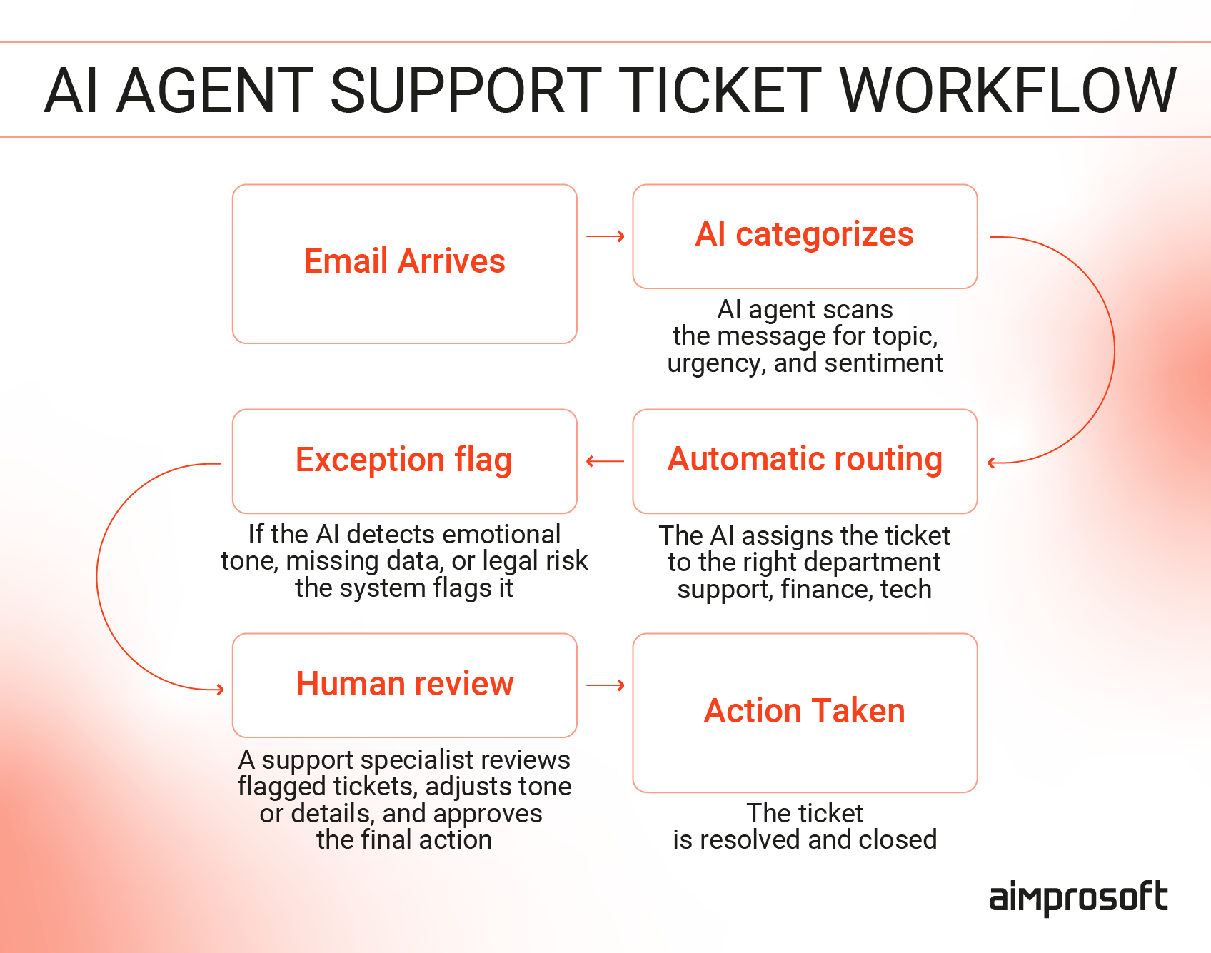 Here’s what that looks like: a support agent triages incoming emails, categorizes them, assigns priority, and routes them automatically. But it flags unusual cases (angry language, VIP customers, legal threats) for human review before taking action.