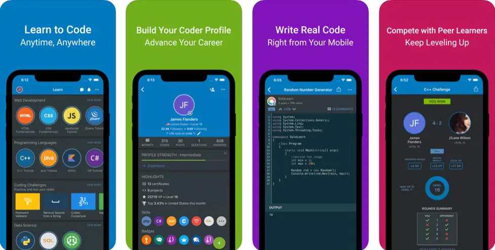 - Sololearn — the user learns the code and, at the same time, gains XP (Experience points), competes with other people in coding, and tracks his/her progress on the global leaderboard.